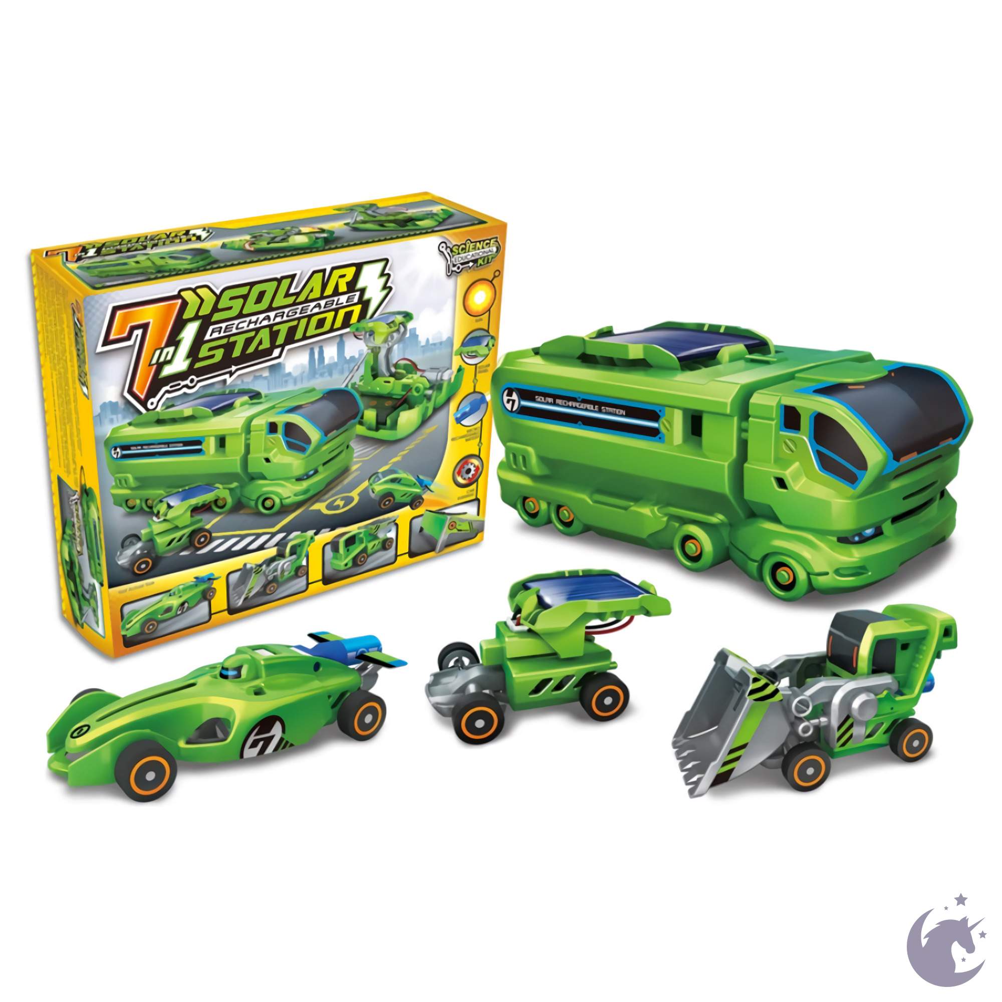 - The 7 in 1 Solar Rechargeable Station transforms into five vehicles, including a race car, a dump truck and a bulldozer. It also converts into two charging stations.